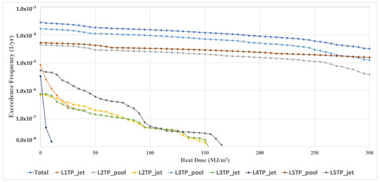 Figure 17 displays the exceedance frequency of the jet fire heat dose and pool fire heat dose under six different leak locations. From it, we could find that, when the leak location was set to leak 3 on PR2_1st deck, the exceedance frequency would be generally greater than the acceptance criteria, and that of the other leak locations was below the acceptance criteria. In order to meet the acceptance criteria for jet and pool fires, the fire DAL could be determined to be 180 MJ/m2 for achieving an exceedance frequency below 10−4 (1/year).