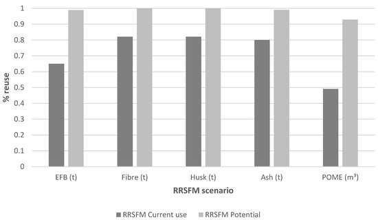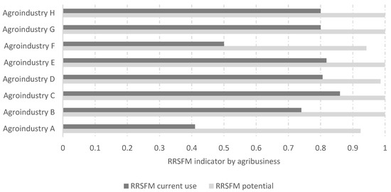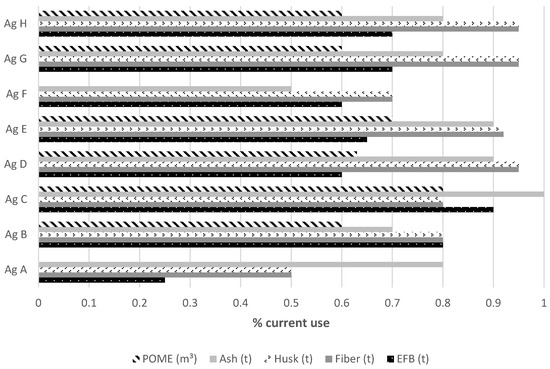 It should be noted that (i) the Current Use parameter corresponds to the environmental management practices implemented by agro-industries according to the alternatives investigated, and (ii) the Potential Use parameter corresponds to the total amount of the different residues and/or susceptible by-products to be used according to the current infrastructure (boilers, composting, fertigation irrigation system, among others). The valued waste and/or by-products must have ideal conditions (regulations and physical and chemical characteristics) that do not generate a negative impact due to their use.