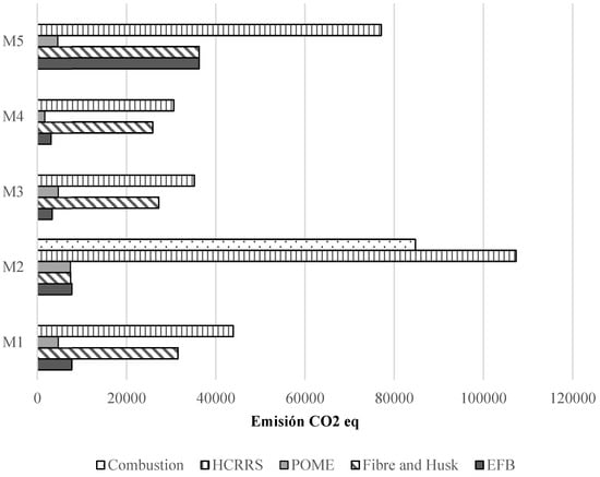 After determining the emission of each residue, the individual data were added to obtain the global emission of the analyzed moment. For this purpose, Equation (9) was implemented, whose result provides values in units of t CO2eq.