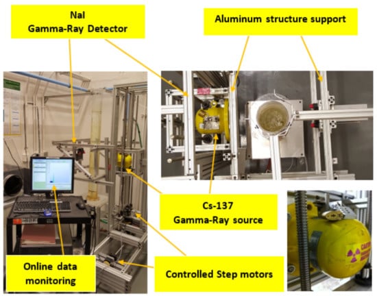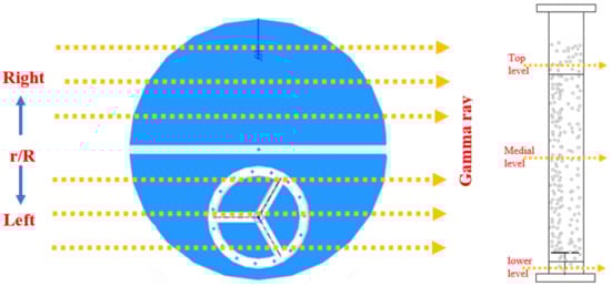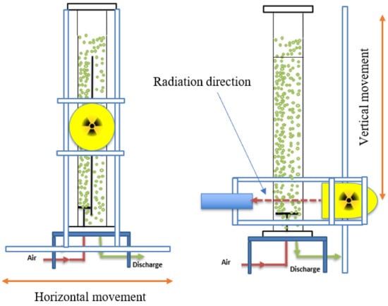 Figure 2 depicted the GRD approach with the cylindrical airlift column. The present GRD technique, set in the Department of Chemical and Biochemical Engineering at the Missouri University of Science and Technology in Multiphase Reactors Engineering and Applications Laboratory (mReal), consists of one gamma-ray source, Caesium-137 (CS-137), and could substitute it with different a gamma-ray source, such as Cobalt-60. This GRD was designed when three-phases are changing dynamically, to measure the distributions in the phases inside the multi-phase reactors. However, in this work, only two stages are involved in the split-plate airlift reactor, therefore, the source of CS-137 was sufficient to quantify the gas holdup. This CS-137 source, with the start of an activity of an enclosed 250-mCi Cs-137 with a 660 keV emission energy, inside a lead-shielded container, was enclosed and sealed. The distance between the gamma-ray source and the detector is 0.5 m and the pixel size 32 × 32.