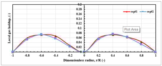 Moreover, the results in Figure 7 present the gas holdup profiles in the middle level under the identical operating circumstances for test 1 and test 2. These comparisons are very much alike in magnitude and behavior for most column diameter locations in the split reactor column. Experiments 1 and 2 produced similar results along the riser and downcomer lengths, indicating the dependability and high accuracy of these measurement procedures. By utilizing the following equation, the average absolute relative difference (AARD) may be determined: