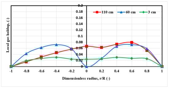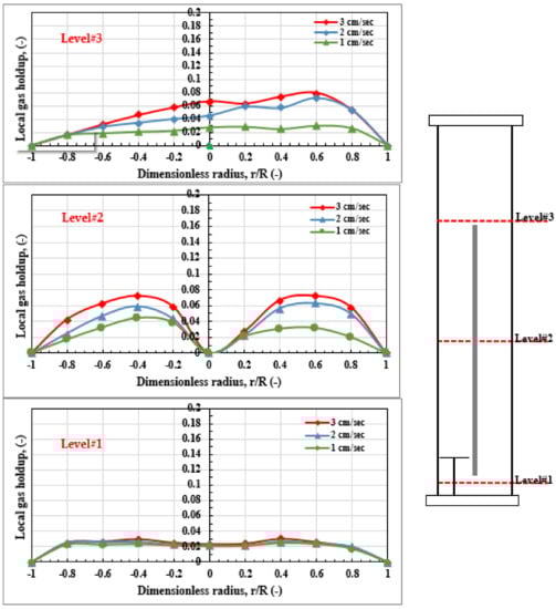 Therefore, GRD scans in this study were conducted through the cross-sectional area of the cylindrical reactor at 3, 60, and 110 cm that represent three various axial heights and 1, 2, and 3 cm/s, which represent a various three gas velocities in order to measure the gas holdup quantity. Figure 9 shows the axial distributions performance of the local gas holdup for all three gas velocities.