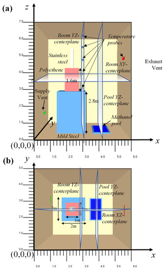 - McGrattan, K.; Hostikka, S.; McDermott, R.; Floyd, J.; Vanella, M.; Weinschenk, C.; Overholt, K. Fire Dynamics Simulator User’s Guide; NIST Special Publication 1019; National Institute of Standards and Technology: Gaithersburg, MD, USA, 2019. [Google Scholar]