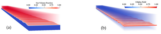 At the present time, GEMMA is already equipped to work with the class-method population balance model [32] available in the reactingEulerFOAM family of solvers. For the stratified flows modelled in this paper, however, a population balance model is not necessary and the volume fraction gradient criterion in Equation (9) is used, with a value of γ equal to 0.1.