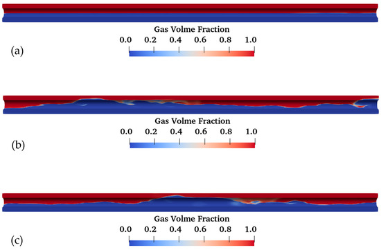 For the estimation of the area of the interface, a flat smooth surface is assumed. From Table 2, while for the 250 experiment the wall shear stress shows good agreement with the experimental value, the interfacial shear is instead largely overestimated. Even so, the pressure drop remains closer to its experimental counterpart. Additional and more detailed studies will be required, even though the larger pressure gradient obtained with a lower wall shear stress supports the overestimation in the interfacial shear in the CFD results. Going back to the momentum balance in Equation (2), the interfacial shear is modelled with the interfacial momentum transfer source and this is essentially provided by the large interface drag, which is therefore the model that will require additional research moving forward. Overall, the pressure drops are more difficult to predict due to the presence of the interface and its influence on the velocity profiles in the gas and liquid regions, which inevitably also affects the prediction of wall shear stresses in single-phase regions near the walls.