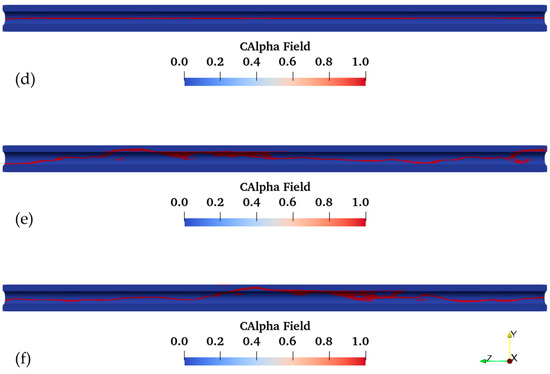CFD results of the distribution of the air volume fraction (a–c) and Cα (d–f) in the annular channel at times t = 0 s (a,d), 15 s (b,e) and 45 s (c,f). (The flow direction is from right to left).
