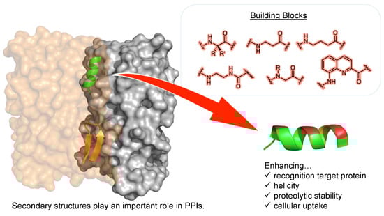 Schepartz and co-workers designed and synthesized β-peptides containing β3-amino acid residues and analyzed their secondary structures [76,77]. In addition, the PPI inhibitory activities targeting the p53/hDM2 interaction, which is a transcriptional activator critical for stress-induced cell cycle arrest and apoptosis, were evaluated. Cancer cells often overexpress hDM2 and downregulate p53, resulting in the promotion of cell proliferation. Therefore, peptides that inhibit the interaction between p53 and hDM2 are promising candidates for cancer therapy. The β-peptides designed using the binding motif of p53 against hDM2 and β3-AA formed stable 14-membered helical structures via a salt bridge between β3-homoglutamate and β3-homoornithine residues. Binding affinity determined using the fluorescein polarization assay revealed that the β-peptides showed higher affinity toward hDM2 when compared with the affinity of the parent α-peptides toward hDM2. They also reported the β-peptides as scaffolds for developing PPI inhibitors that block human immunodeficiency virus-1 (HIV-1) fusion using the same strategy [78]. As described above, the introduction of β-AA residues in specific patterns should mimic the α-helix [69]. Based on this knowledge, α/β-peptides containing cyclic β-AA residues based on the C-terminal heptad-repeat (CHR) domain of HIV protein gp41 were designed [79]. gp41 is expressed on the surface of the envelope of HIV and forms a critical bundle intermediate that drives the fusion of the viral envelope with the target cell membrane. The formation of bundle intermediates requires the interaction of the CHR with the N-terminal heptad repeat (NHR) domain. Therefore, CHR mimics may inhibit the formation of bundles and inhibit the fusion process of HIV. α/β-Peptides with the ααβαααβ pattern were designed to stabilize the helix structure through the formation of a salt bridge. The α/β-peptides showed higher affinity against the NHR domain than the parent α-peptide. Moreover, the introduction of β-AAs into the sequence prolonged the half-life of the peptides against digestive enzymes by 1000-fold. Thus, α/β-peptides increased the affinity toward target proteins and improved peptide stability, demonstrating the potential development of therapeutic reagents.