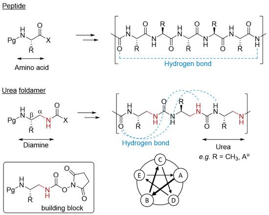 Urea-type helical foldamers are classified as a type of γ-peptide in which a methylamino motif is inserted into α-amino acids and have been used in drug discovery research [116,117]. In 1995, a solid-phase synthetic method was reported by Burgess et al. [118,119]. In their method, the urea bond was constructed from isocyanate prepared from the carboxyl group of natural amino acids. In 2000, Guichard and co-workers developed a building block with an hydroxysuccinimide group as the reactive functional group for polyurea synthesis (Figure 2) [120]. This building block is currently used as the primary synthetic method for polyurea construction. The urea building blocks are derived from natural amino acids. Therefore, their side-chain environments closely resemble those of natural helical peptides. The characteristic features of polyurea peptides, studied extensively by Guichard and co-workers, include forming helical structures with 2.5 residues per turn via intramolecular hydrogen bonds [121,122]. This structural feature is found in native peptides, which form helical structures by hydrogen bonding between amide and carbonyl groups in the peptide backbone, indicating that polyurea foldamers can be designed to mimic natural peptides.