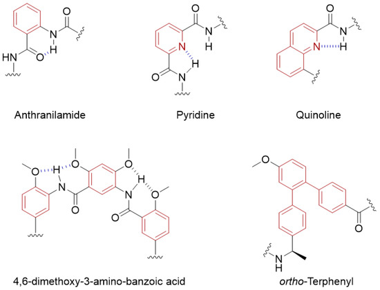 Helical peptide foldamers containing aromatic building blocks have been developed (Figure 3). Aromatic peptide foldamers generally adopt helical structures similar to helicene [117,129]. The driving force stabilizing the helical structures is the π-π stacking interaction between aromatic rings and hydrogen bonding between the ring nitrogen lone pairs and amide bonds. In 1994, Hamilton and co-workers initially reported aromatic foldamers composed of anthranilic acid amide [130,131] and pyridine-2,6-dicarboxylic acid [129,131]. Subsequently, in 2003, quinoline-type [132,133] foldamers were reported by Huc and co-workers. Ortho-terphenyl is another motif used commonly to construct helical structures, and its peptide-type helical foldamers have been reported by Gellman and co-workers recently [134].