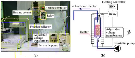 A glass column with an internal diameter of 9 mm was used for the research. The temperature was maintained at a given level using a heating element and a controller with a thermocouple located directly inside the column. The heating area was additionally insulated with non-combustible mineral fiber and asbestos cloth. The temperature measurement error was 1–3 °C. The thermocouple was pre-coated with a shell of chemically resistant plastic, which excluded its destruction in a solution of sulfuric acid. The decontamination solution was fed into the column from below, after which it was collected using a fraction collector for subsequent activity measurement. The flow rate of the solution into the column was 3 mL/h, and the resin volume was 2 mL. Figure 2 shows the appearance of the installation and its conditional scheme.