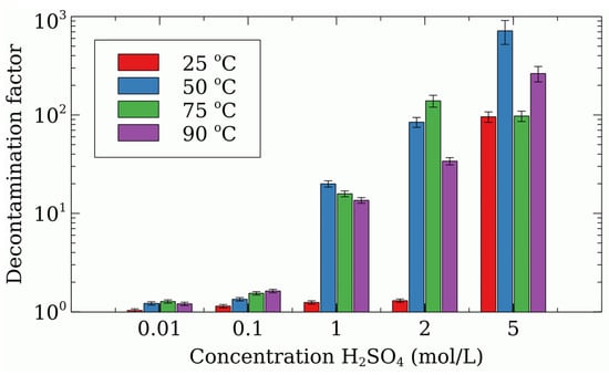 Table 2 shows the DF values as to dependence on H2SO4 and FeSO4 concentrations and temperature. According to the obtained results, the increase in the FeSO4 concentration in H2SO4 solution is accompanied with an increase in the efficacy of SIER decontamination over the whole temperature range. However, this effect becomes noticeable only when using H2SO4 solutions of concentrations of 0.2 mol/L and higher. The increase of the FeSO4 concentration from 0.01 up to 0.2 mol/L increases the DF value by 1–2 orders of magnitude, which is especially noticeable when using 1 M solution of H2SO4. Thus, the addition in the form of FeSO4 enables the use of H2SO4 solutions of lower concentrations without a loss of decontamination efficacy, which, in theoretical terms, decreases potential costs and equipment corrosion.