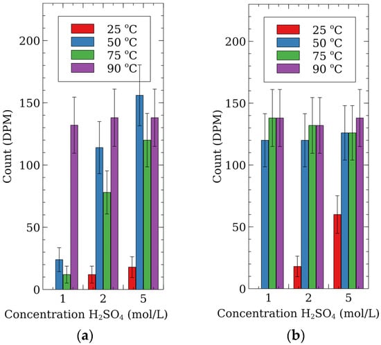Figure 4 shows a diagram of the activity of the H2SO4 solution in decays per minute (DPM), at continuous contact with the model SIER, and its change depending on concentration, temperature, and time. When using 0.01 M and 0.1 M H2SO4 solutions, the values of the counting number of pulses remained below the limit of statistical significance considering background values and are not shown in the figure. At 25 °C, as time passed, there was an increase in the activity in the 2 and 5 M solutions of H2SO4, which indicated the gradual dissolution of iron oxide deposits. However, we found that in the temperature range of 50–90 °C, the activity of 2 and 5 M H2SO4 solutions could decrease. This fact is associated with the process of secondary adsorption of Co-57, which is transferred into the solution in the ionic form during the dissolution of iron oxide deposits. Along with the increase in the concentration and temperature of the solution, the efficacy and rate of dissolution of iron oxide deposits increase, which is then followed by secondary adsorption of the radionuclide.