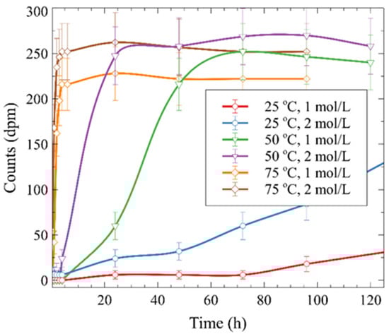 To evaluate the effect of the secondary adsorption process on the efficacy of SIER decontamination, we built kinetic curves of the dependence of the H2SO4 solution activity on the contact time (Figure 5). The effectiveness of decontamination at 90 °C was not evaluated due to the proximity of the results obtained at 50 and 75 °C. The activity of the H2SO4 solution is also given in decays per minute.