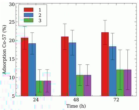 The preliminary introduction of NaNO3 (3 mol/L) into the H2SO4 solution does not exclude secondary adsorption. Figure 6 shows the diagrams of adsorption extraction of the Co-57 radionuclide by the ion-exchange resin KU 2-8 in the solutions of various compositions.