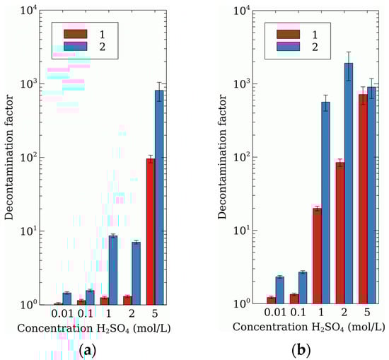 A diagram in Figure 7 shows the effect of additional washing with NaNO3 solution on the efficiency of SIER decontamination. This procedure increases the DF value due to the desorption of residual Co-57: this effect is clearly manifested in 1M and 2M H2SO4 solutions. After decontaminating the SIER at a temperature of 50 °C followed by washing with a NaNO3 solution, the DF values obtained in 1M and 2M H2SO4 solutions have a comparable value.