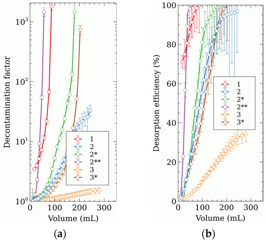 The effect of the concentration of H2SO4 solution on the decontamination efficiency of the model SIER under dynamic conditions at 50 °C. (a) The dependence of the decontamination coefficient on the volume of H2SO4 solution, (b) the dependence of the decontamination efficiency on the volume of H2SO4 solution. 1—2M H2SO4, 2—1 M H2SO4, 2*—1 M H2SO4 + 0.1 M FeSO4, 2**—1 M H2SO4 + 0.2 M FeSO4, 3—0.2 M H2SO4, 3*—0.2 M H2SO4 + 0.2 M FeSO4.