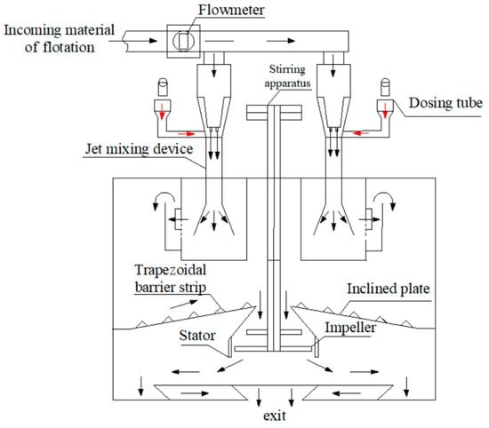 - In this paper, a jet stirring combined device of coal slime floatation and mixing (China Patent, ZL2015108627218) is proposed. The main function of the jet mixing device is to realize the full mixing of reagent, air bubbles and coal slurry. The main function of the stirring apparatus is to keep the multiphase particles suspended in the mixing tank. The test of the jet mixing effect and diameter size migration law of injected bubbles show that the design idea of this device is correct.