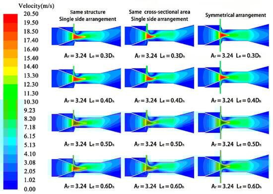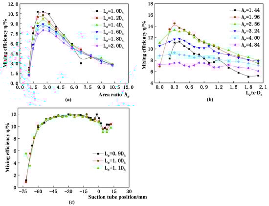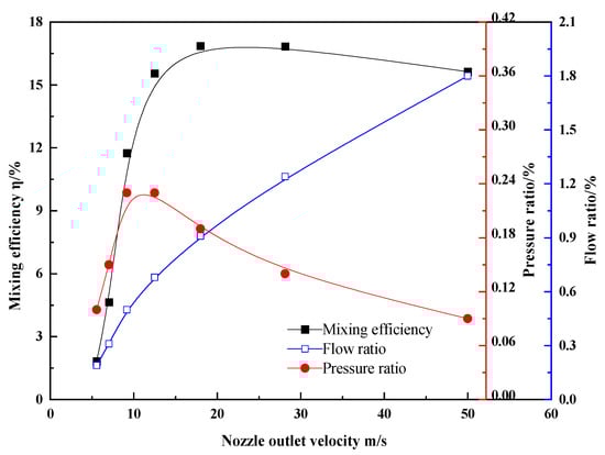 - Considering the suction performance, when the area ratio , the throat-nozzle distance , the suction tube is located at 1/4 ~1/2 position on the left side of the nozzle outlet and is symmetrically arranged, and the length of the throat tube is 6~12, the suction performance of the jet mixing device is the best. The nozzle outlet velocity can effectively improve the injection capacity, but the increase in velocity will cause a loss of energy. Each jet mixing device has the optimal pressure ratio and flow ratio coordination, and the mixing efficiency is the highest when the velocity is 18m/s.