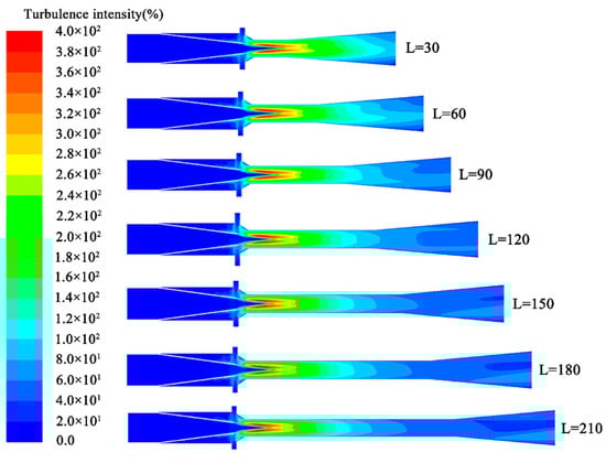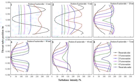 - According to the flow field distribution characteristics in the device, the area ratio has a more significant effect. If the area ratio is larger, the turbulence intensity around the flow core is larger, the pressure drop in the throat tube is faster, the flow core also disappears faster; and the mixing between the working fluid and the injection fluid is more favorable. The throat-nozzle distance has little effect on the flow field distribution. When the throat-nozzle distance is less than 0.2, the flow core is longer, which is unfavorable to fluid mixing. The optimal throat-nozzle distance is 0.3~0.6. The outlet area of the nozzle (0~) directly opposite the suction tube is the most ideal, which is conducive to kinetic energy exchange between the working fluid and the ejector fluid in the throat tube. The suction tube is arranged symmetrically on both sides, and its turbulence intensity image is highly symmetrical, which is conducive to momentum exchange and mass mixing between the working fluid and the injection fluid in the throat tube. When the throat tube length L is greater than 9, the turbulent region does not increase. Considering the mixing characteristics of the flow field, the throat tube length should be greater than 9. Under different nozzle exit velocities, the velocity of each point in the cross section below the middle part of the throat tube (greater than 10) tends to be consistent, indicating that the mixing of working fluid and injection fluid can be completed in a limited length of the throat tube, independent of the nozzle outlet velocity.