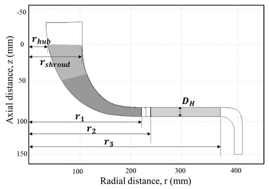 The NASA CC3 model was used as an industrial air compressor to validate the effect of wet compression on the centrifugal compressor, and its performance and efficiency have been proven through various experiments [16,17]. The model impeller consists of 15 blades and 15 splitters, and the diffuser consists of 24 vanes. The design point of the analysis model is a 4.17 pressure ratio and 21,789 rpm, and the operating flow rate is 4.54 kg/s. Detailed dimensions are shown in Table 1 and Figure 1.
