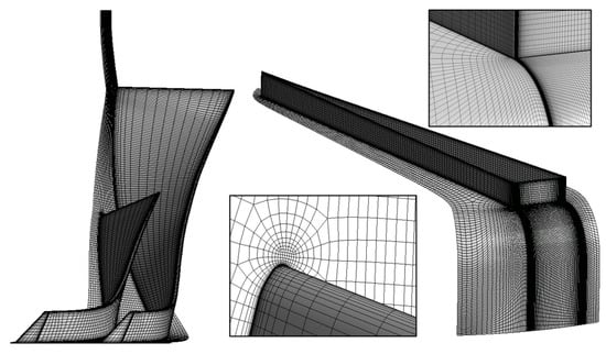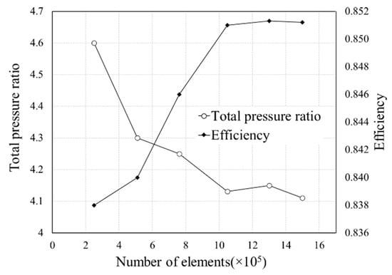 Securing a reliable grid system is one of the important processes in the CFD. In this study, structured grids for CFD were generated using ANSYS TurboGrid. Figure 2 shows the grid of the compressor, including the impeller and diffuser. For the blade flow path, an O-grid system was used for the surface near blades, and an H-grid system was used for other regions. In addition, a grid dependency test was conducted to minimize the influence of the grid (see Figure 3). The pressure ratio and isentropic efficiency were chosen as the evaluation index, and it was confirmed that the result value converged at about 1.2 elements. Therefore, a final 557,798 grids were used in the impeller region and 509,082 grids in the diffuser region, and a total of 1.2 grids were used.
