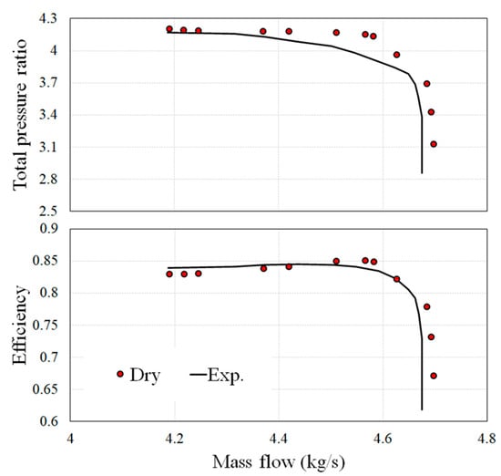 To validate the numerical analysis method, the CFD results were compared with existing published data [16,17,18]. For comparison, the pressure ratio and isentropic efficiency, which are the compressor performance index, were compared. The pressure ratio and isentropic efficiency are defined as follows: