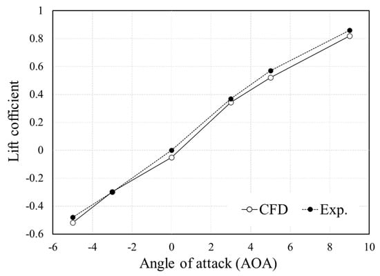 In this chapter, a two-phase flow model also needed to be verified. To validate the two-phase flow model, the NACA 0012 model was chosen. The experimental result [19] and CFD results were compared when NACA 0012 was rained on (refer to Figure 5). As a result of validation, it shows that an angle of attack (AOA) was performed on the airfoil from −5° to 9°, and all relative errors came within 7%. It was judged that the two-phase flow model used in this study is acceptable for this study.