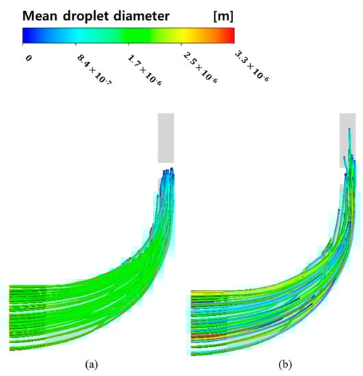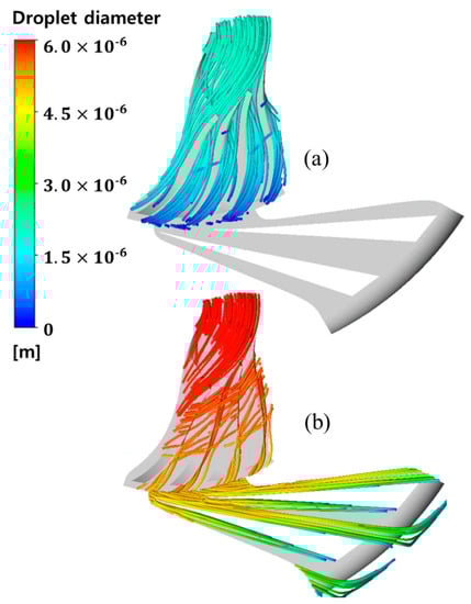 To increase precision in the analysis results, the intermediate values of particle sizes having high efficiency intervals (1~3 μm) were additionally analyzed. When the droplet diameter was changed, the best aerodynamic performance was shown at 2 μm. On the contrary, the aerodynamic performance was lowest at 6 μm. The results of the droplet trajectory at 2 μm and 6 μm are compared in Figure 10.