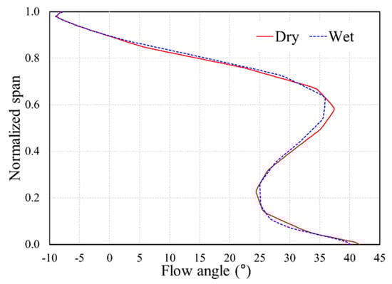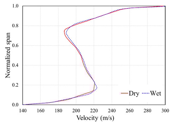 Wet compression technology affects not only the thermodynamic aspects, but also the aerodynamic aspects, due to the droplets’ motion. Figure 7 shows the velocity distribution of the impeller outlet, and Figure 8 shows the velocity angle distributions at same position as shown in Figure 7.