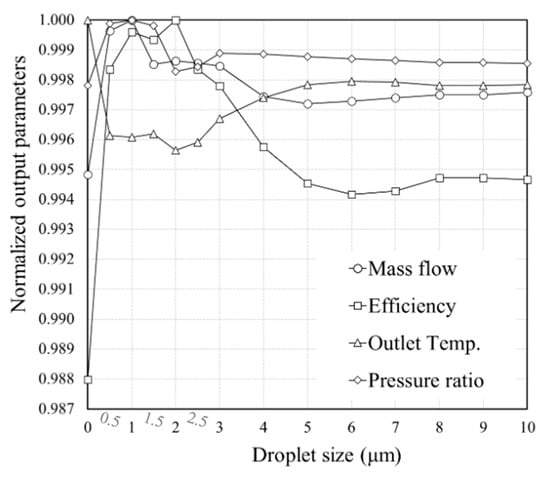 To scrutinize the effect of the droplet size on the centrifugal compressor performance, the flow rate, outlet temperature, pressure ratio, and isentropic efficiency were compared, varying the droplet diameter from 1~10 μm. The results were normalized for the convenience of comparison according to the droplet diameter and are shown in Figure 9. The isentropic efficiency had the highest values at the droplet size of 2 μm, and the values of other droplet diameters were normalized based on 2 μm. The outlet temperature was normalized with 6 μm and was calculated by the following equation: