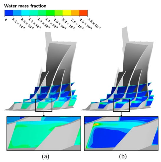 Comparison results of the leakage flow between the (a) dry and (b) wet compression.