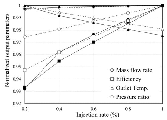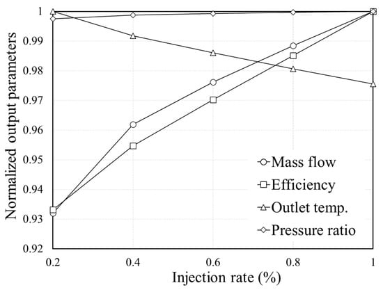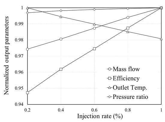 - At the design point, the performance was compared by changing the droplet diameter by 1 to 10 μm. The droplet diameter was best at 2 μm, and the performance deteriorated from the droplet diameter with a size of 6 μm or more. This is because the evaporation rate decreased as the surface area of the droplet was different while having the same mass flow rate. In addition, the droplet diameter with 6 μm quickly departs from the main flow due to its relatively large mass. As a result, it was established that most of the droplets moved toward the tip, generating more leakage flow and forming an unstable flow. The performance improves linearly as the water injection rate increases. Accordingly, the outlet average temperature difference between a 1% spray and 0.2% spray was 9.3 K.