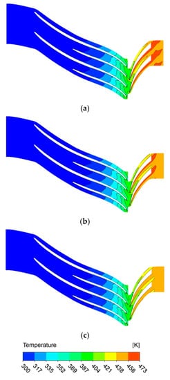 Comparison results of the temperature contour under different droplet mass flow rates at a span 50%. (a) 0.2% (0.00092 kg/s); (b) 0.6% (0.00276 kg/s); (c) 1% (0.0046 kg/s).