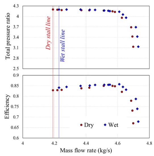 In this section, the effect of wet compression technology on a wide range of flow rates, from design flow rates to flow rates near surge, was analyzed. Figure 14 illustrates the dry and wet compression performance curves for the pressure ratio and efficiency. In the wet compression technology, based on the previous section, the size of the droplet was 2 μm, and the injection rate was 0.2% of the air flow rate. In wet compression, both the pressure ratio and the isentropic efficiency moved to the right, which means that more flow rates had passed compared to the same performance. When wet compression technology is applied, the surge condition moves toward a high flow rate. To confirm this, the stall margin was evaluated, which is expressed as follows: