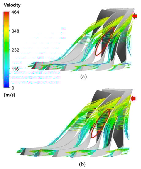 The SM value decreased by 2% in the wet compression compared to the dry compression. In general, the surge phenomenon occurs at a low flow rate point and occurs in the impeller and diffuser regions, causing an instability in the flow. Accordingly, the droplet motion changes the flow inside the impeller to reduce SM. Figure 15 shows the leakage flow occurring at the top of the tip clearance (red arrow) near the surge point. In the case of (a) dry compression, a few parts of the leakage flow generated from the top of the shroud went to the adjacent blade, but in the case of (b) wet compression, it can be noted that a large amount of the leakage flow generated from the top moved to the adjacent blade and formed a blockage (red circle). As a result, in wet compression, there is relatively more leakage flow that does not flow downstream and is stagnant.