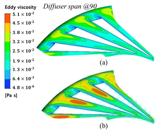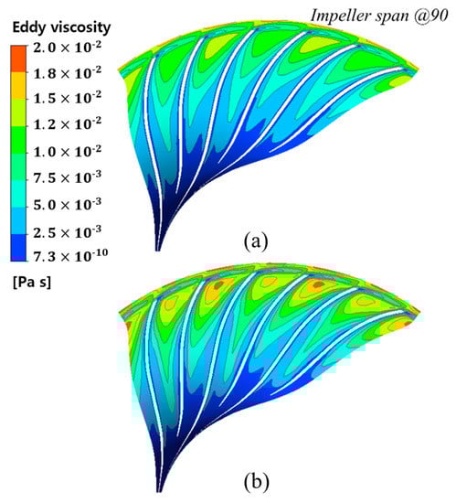 Figure 16 and Figure 17 show the eddy viscosity in the dry and wet compression at a span of 0.9 (normalized between the hub to shroud). Figure 16 shows that a relatively higher eddy viscosity occurred in (b) the wet compression compared to (a) the dry compression near the outlet of the impeller.
