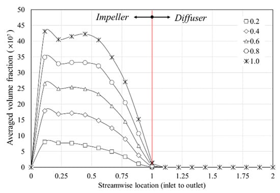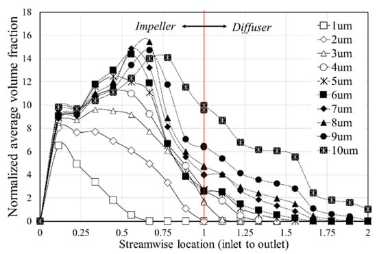 Averaged volume fraction along the streamline position with different droplet sizes.