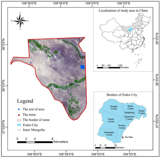 The study area is located in Wudinghe Town, Wushen Banner, Ordos City, Inner Mongolia Autonomous Region, at the southernmost end of the Nalinhe Mining Area in the Shendong Coalfield. The area is about 17.8 km long, 13.5 km wide, and 176.34 km2 in area. The surface subsidence is mainly controlled by the working face inclination. The measured maximum subsidence of the surface inclination is 2.72 m and the maximum subsidence of the strike is 1.52 m. The geographic coordinates are east longitude 108°51′30″–109°00′00″, and north latitude 37°58′00″–38°05′30″, as shown in Figure 1.