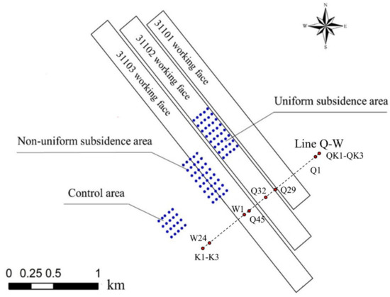 In the uniform subsidence area, the non-uniform subsidence area, and the control area, sections of 200 m × 600 m area, 200 m × 600 m area, and 200 m × 300 m area were selected for sampling distribution, respectively. The checkerboard method was used for sampling, the grid design was 50 m × 75 m, and each sampling point was at the center of the grid. A total of 100 sampling points was arranged in the three areas including 20 in the control area, 40 in the uniform subsidence area, and 40 in the non-uniform subsidence area, as shown in Figure 2.