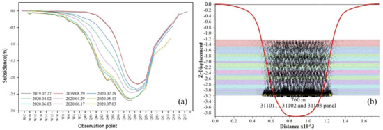 (a) Dynamic characteristics of dip surface subsidence curve of the working face (layout of survey line Q–W). (b) Prediction results of the settlement numerical simulation.