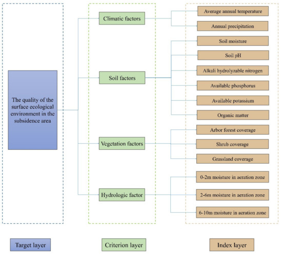 The analytic hierarchy process (AHP) includes the target layer, criterion layer, and index layer. The target layer judges the ecological environment quality of the subsidence area as a whole and expresses the surface ecological environmental quality of the subsidence area; the criterion layer reflects the ecological environmental stability of the target layer from different factors including climatic factors, soil factors, vegetation factors, and hydrological factors; and the index layer is the most basic level of the evaluation index system of the ecological environmental quality in the subsidence area, and the criterion level is directly measured including the annual rainfall, average annual temperature, surface soil moisture, pH value, alkali-hydrolyzable nitrogen, available phosphorus, available potassium, organic matter, arbor vegetation coverage, shrub vegetation coverage, grassland vegetation coverage, and vadose zone moisture (0–2 m, 2–6 m, 6–10 m). The AHP hierarchy model is shown in Figure 4.