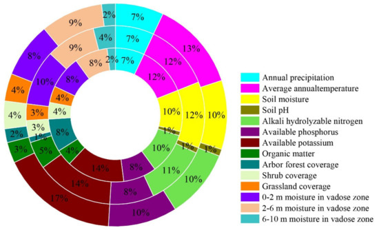 It can be seen from Table 1 that the meteorological factors refer to “Precipitation Grade Standard” (GB T 28592–2012) and “Temperature Evaluation Grade” (GB/T 35562–2017). The index of the soil physical and chemical properties adopted the “Second National Soil Census Classification Standard” and was determined in combination with the actual local environmental conditions; the changes in vegetation coverage refer to the “Technical Specifications for Evaluation of Ecological Environment Conditions” (HJ 192–2015); and the vadose zone soil moisture was determined with reference to the “Second National Soil Census Grading Standard”, combined with the relevant literature and the local actual environmental conditions [38,39]. According to the above grading standards, the ecological rating of each index corresponding to the value range was determined.