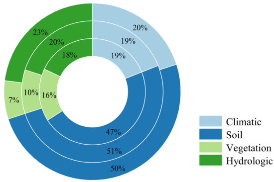 It can be seen from Figure 6 that the soil factors and hydrological factors had higher weights in the eco-environmental quality evaluation, accounting for 60–70%, and the weight of the climate factors and vegetation factors in the evaluation of the ecological environmental quality was lower, accounting for 30–40%, indicating that the change in the water and soil environment caused by the coal mining subsidence is the main factor affecting the ecological environmental quality at the small regional-scale of a coal mining subsidence area.