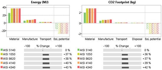 The results obtained from the software are displayed in Figure 2, showing the comparison of energy consumed and the CO2 footprint of every material through its life cycle, from the extraction of the raw material to the disposal and the end-of-life potential that each one has. In this sense, the most environmentally friendly material was the AISI 5140, followed by the AISI 1050. The research done by Vinodh and Jayakrishna, showed that in the manufacturing company ABC, the replacement of the material AISI 347 SS annealed with the AISI 1050 reduced the CO2 footprint by nearly 10 kg and the energy consumption by 93 MJ [30]; however, here, it could be seen that the AISI 5140 was even more environmentally friendly material and could be considered. The chart shows that the AISI 5040 needed less energy to be extracted and manufactured, and produced less CO2, while the transportation and disposal were the same; nevertheless, the end-of-life potential of the AISI 5040 was the worst, which meant that it was not as re-usable as the other materials in recycling matters.