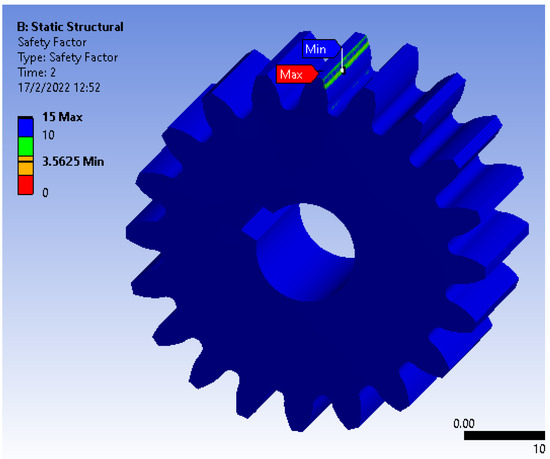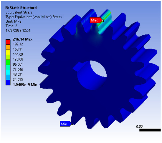 Moreover, making the right selection of the material for a mechanical system considering the environmental aspects is important for the development regarding the functionality of the part with the replace material. In this way, the simulation by finite elements method (FEM) allows static and thermal analysis, and, thus, optimization leading to more reliable parts [22] where the pinion has to endure forces in the teeth due to the curved surface that pushes one against the other to produce the rotary motion [23], and that is the phenomenon that can be replicated with the FEM. In this sense, the research of Chen et al., using computational simulations, proved the importance of mesh performance on modified straight bevel gears, showing that the modifications on tooth end relief and symmetric crowns allows them to avoid the edge effect and alignment errors, hence, reducing the sensitivity of bending and meshing impacts and improving the results of bending fatigue [24] that can be directly associated to the LCA of the gears [24]. Lingbeek et al. developed a spring back compensation with finite elements deep drawing simulations which proved to be useful in feasibility checks and (re)design of deep drawing tools [25]. Szmytka et al. performed finite elements simulations to detect the areas that would suffer more and identify a potential lifetime of a diesel engine piston, making it possible to adjust the experimental values as close as possible to the real thermal conditions needed [26]. In the research of Chopane et al., a steering system was developed with the material Nylon 66 in the rack and pinion design, where the simulations showed that applying a moment of 13,000 N*mm−2 to the pinion in an anticlockwise direction gave a maximum deformation of 0.1811 mm and a maximum stress of 16.296 MPa, which is acceptable for the Nylon 66 [11], while a simulated structural transient comparison between the most preferred materials for manufacturing rack and pinion systems, revealed that the nickel aluminum bronze alloy got a von Mises stress of 0.001 MPa, making it the best [12].