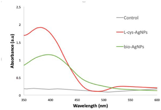 UV−Vis spectrum of the L-Cys-AgNPs (red), the bio-AgNPs (green), and the control AgNO3 (grey).