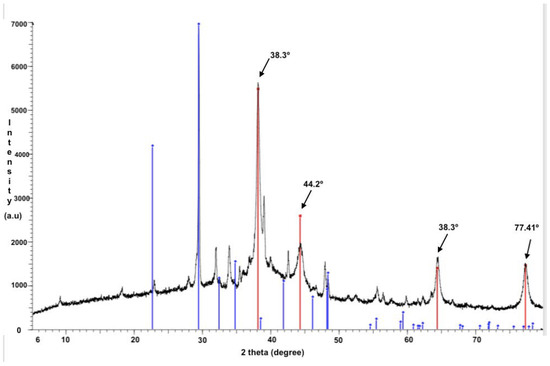 The XRD pattern of the cotton fabric modified with L-Cys-AgNPs is presented in Figure 2, showing peak values in the L-Cys-AgNPs of 38.2°, 44,3°, 64.2°, and 77.2°; assigned to (111), (200), (220), (311), and (222) planes, respectively, results that agree with the findings of Khan et al., 2012 [17]. These results confirm the presence of silver nanoparticles with metallic silver (Ag0), in a face-centered cubic (FCC) format on the cotton fabrics covered in L-Cys-AgNPs. In addition, the grain size of the AgNPs was calculated using the Debye−Scherrer equation [19] resulting in 13.7 nm (a). On the other hand, the XRD pattern of the cotton fabric containing bio-AgNPs is not present because the concentration on the fabric was not great enough, and thus unable to produce a signal associated with the presence of AgNPs. Nevertheless, the expected outcome was the appearance of similar peaks, which were found for the L-Cys-AgNPs, which correspond to the presence of metallic silver.