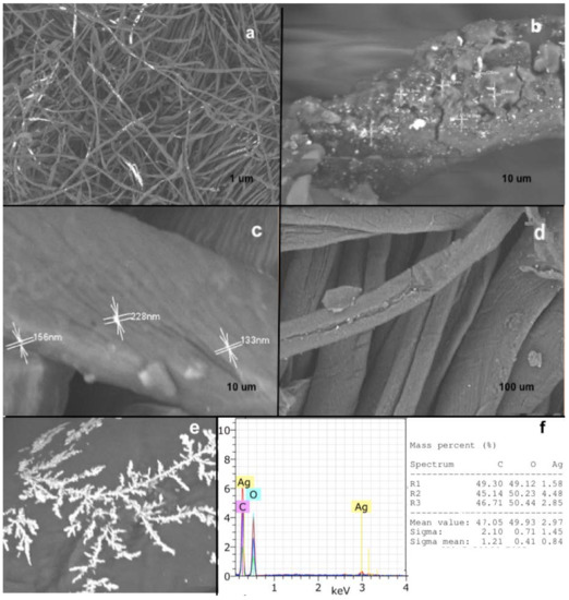 SEM-STEM analysis of the cotton fabric covered in L-Cys-AgNPs (a,b); the cotton fabric covered in bio-AgNPs (c,d); and the control (e). In addition, EDX spectra (f) displaying the composition of the L-Cys-AgNPs at pH 8.6 and the presence of a peak at 3 keV characteristic for Ag, as determined by the AgLα lines.