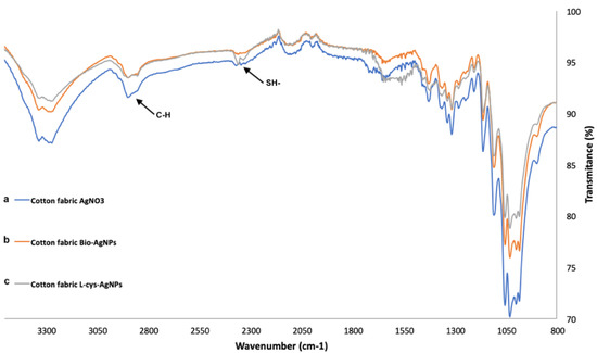 These findings were corroborated by FT-IR, which was used to analyze the fabrics covered with L-Cys-AgNPs (a), bio-AgNPs (b), and AgNO3 (c), by analyzing the presence of functional groups on the samples. As seen in Figure 4, the spectrum of the cotton covered with L-Cys-AgNPs (a) exhibited a band near 2350 cm−1, corresponding to the presence of mercaptans -SH [22]. This band clearly disappeared for the spectrum obtained from the samples with cotton covered in bio-AgNPs (b) and the fabric covered in AgNO3 (c), showing that the thiol groups from the L-cysteine present on the cover of the AgNPs were successfully present on the cotton. L-cysteine present on the AgNPs has a major role in the durability of the antimicrobial activity of the cotton, mainly because it contains a carboxylic acid (2800–3000 cm−1) [23]. and amino group, which react with the cellulose on the cotton through an esterification reaction, being covalently bonded and preserved in time [24]. On the other side, the spectrum of the cotton covered in the bio-AgNPs (b) showed no major differences with the control (c). In this sense, these results showed a difference between the capacity of the L-Cys-AgNPs to form bonds with the hydroxyl groups from the cotton in comparison with the nanoparticles synthetized with the presence of a living organism where no sign of a bonding with the cotton fabric is seen.