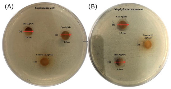 Measurement of the antibacterial activity of the cotton fabric covered in L-Cys-AgNPs, bio-AgNPs, and AgNO3 was carried out via disk diffusion assay against Staphylococcus aureus ATCC 14028 and Escherichia coli ATCC 25922 [25].